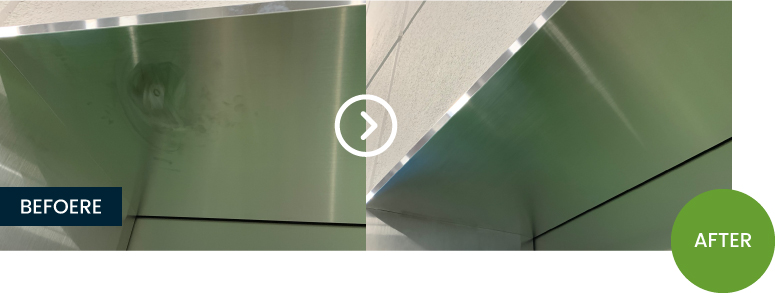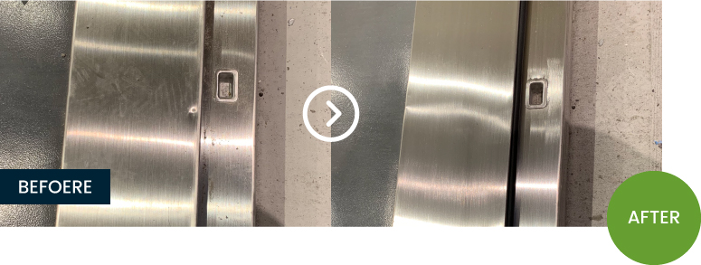 ステンレス製エレベーター三方枠の大きなへこみ部分を溶接後平らにし磨き補修いたしました。