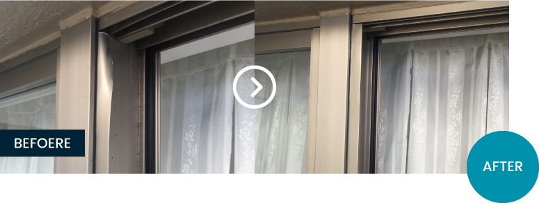 台風被害によるアルミサッシのへこみを綺麗に補修いたしました。